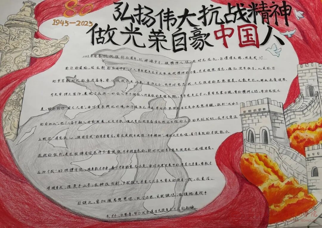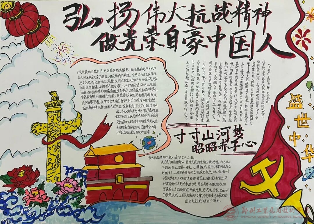 为深化思想政治教育,引导师生坚定理想信念,树立正确的世界观、人生观和价值观,9月18日,我校团委组织全校学生集中观看“思政大课”大学课程《大国担当》,以手抄报创作形式开展学习心得。创作过程中,师生们积极查阅资料、精心设计版面,有的以红色故事为素材绘制连环画,有的用金句摘抄传递思想力量,从理学认知向信念生成转化,引导郑工广大团员青年坚定使命担当。