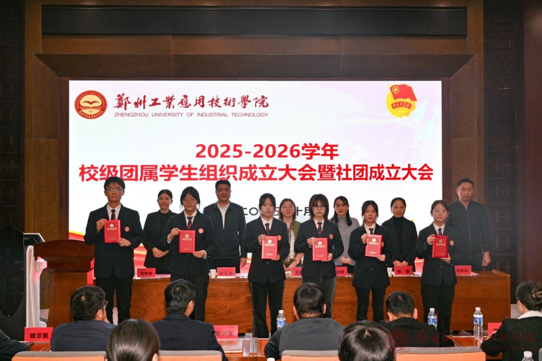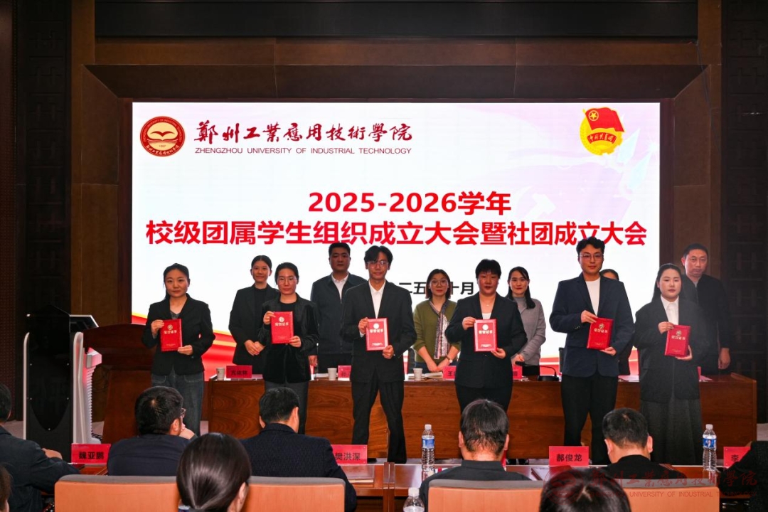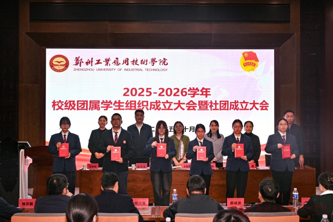 会上,团委书记亢依林宣读校团字〔2025〕30号《郑州工业应用技术学院关于聘任 2025-2026学年校级团属学生组织学生干部的决定》,党委宣传部部长杨莹宣读校团字〔2025〕31号《郑州工业应用技术学院关于 2025-2026 学年社团名单公示》,党委组织部部长孙英豪宣读校团字〔2025〕32号《郑州工业应用技术学院关于 2025-2026学年社团指导教师及社团负责人的聘任的决定》,与会领导为团属学生组织代表、社团负责人、社团指导教师颁发聘书。