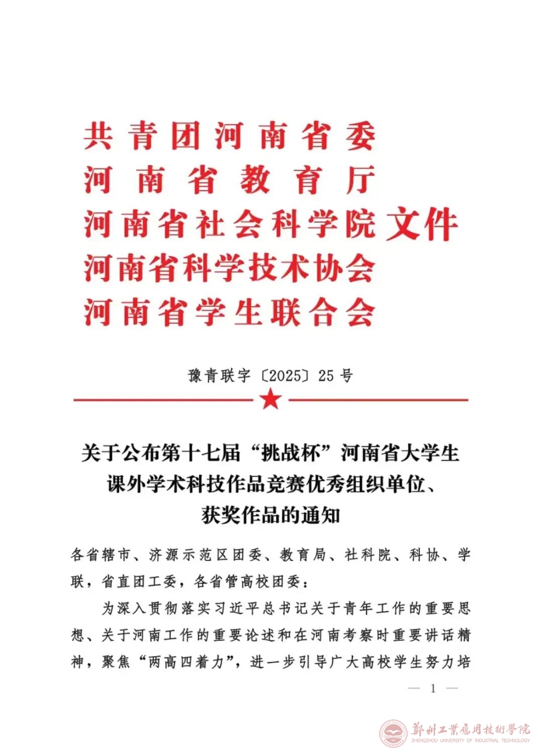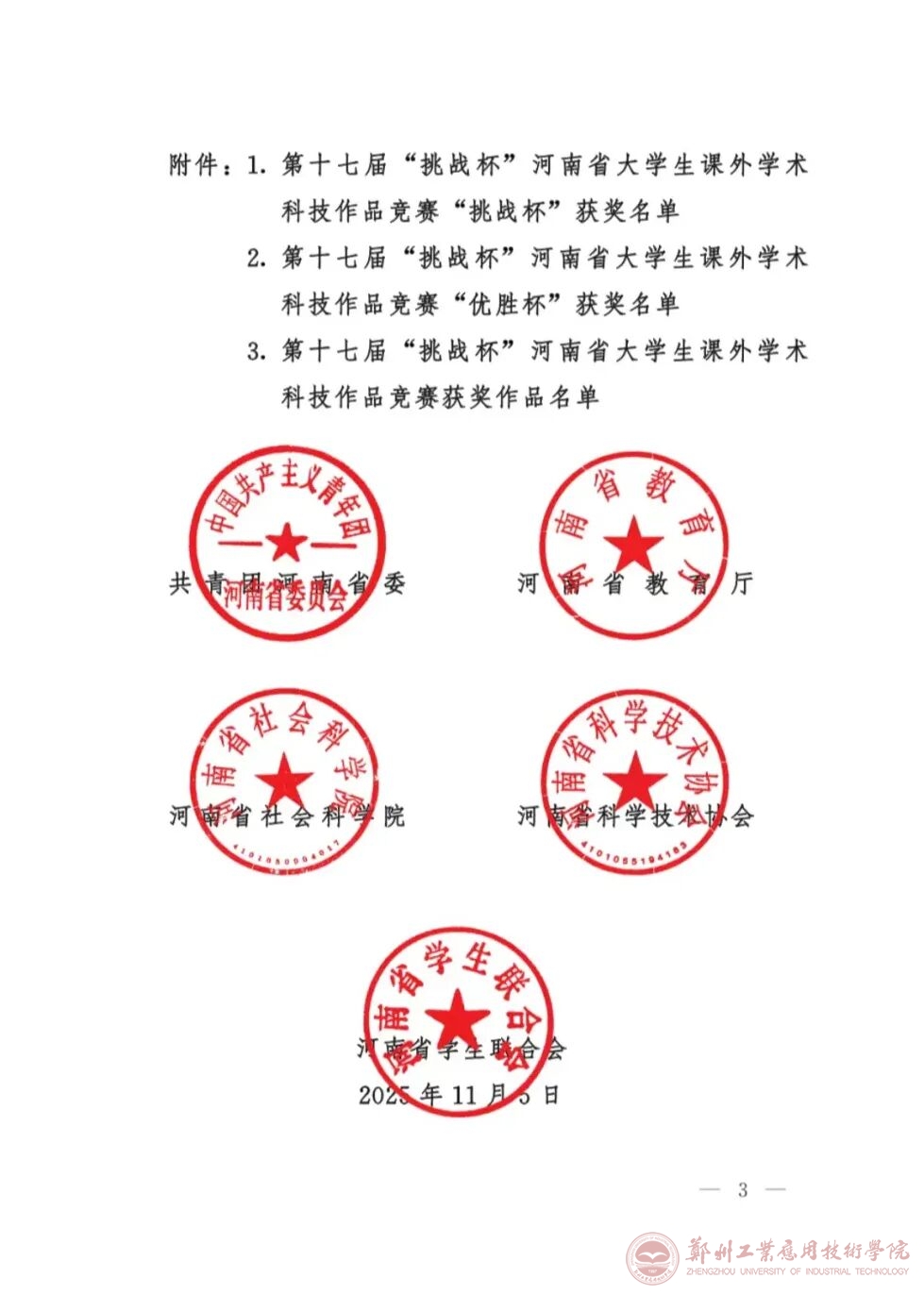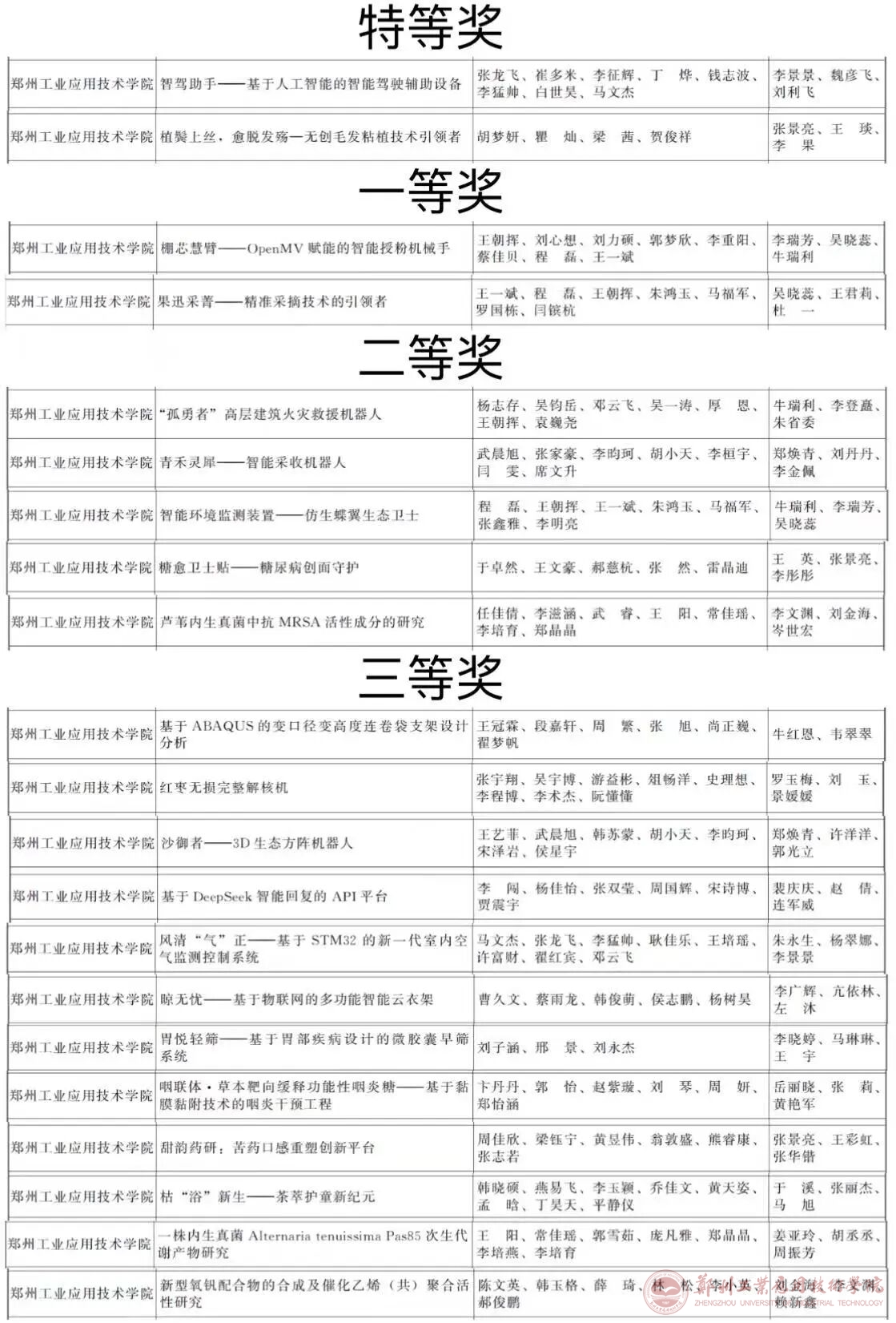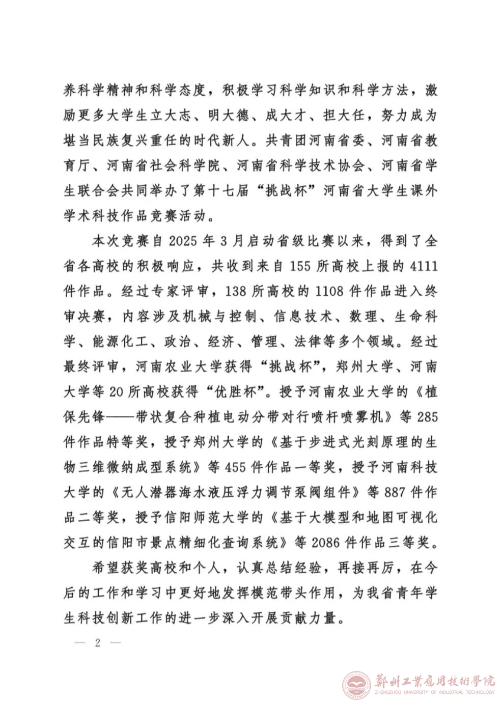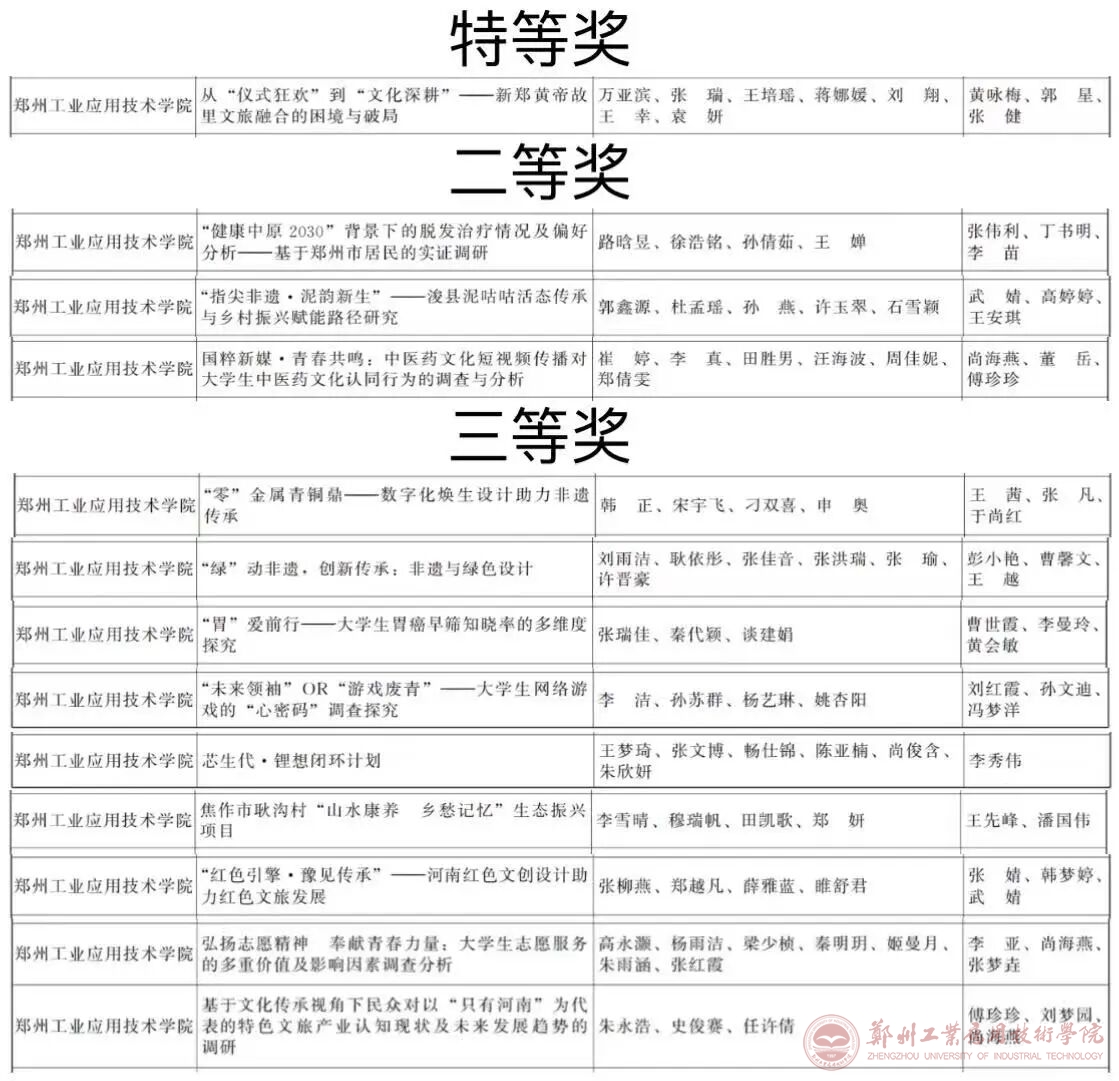 近日,由共青团河南省委、河南省教育厅、河南省社会科学院、河南省科学技术协会、河南省学生联合会联合举办的第十七届“挑战杯”河南省大学生课外学术科技作品竞赛获奖名单公示完成。我校共申报项目36项,获得奖项34项,分别是:理工科类特等奖2项,一等奖2项,二等奖5项,三等奖12项;哲学社会科学类特等奖1项,二等奖3项,三等奖9项。