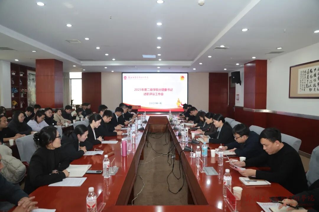 为深入学习贯彻习近平总书记关于青年工作的重要思想,全面落实团中央《基层团组织书记述职评议考核暂行办法》要求,压实基层团组织书记责任,切实提升团组织引领力、组织力、服务力和大局贡献度,1月7日,我校2025年度二级学院分团委书记述职评议工作会在行政楼6楼西会议室顺利召开。党委副书记、副校长王美英,学生工作部、党委组织部、党委宣传部、校团委负责人,各院(部)党委书记、学管副院长,各学院分团委书记以及师生代表参加会议。会议由校团委书记亢依林主持。
